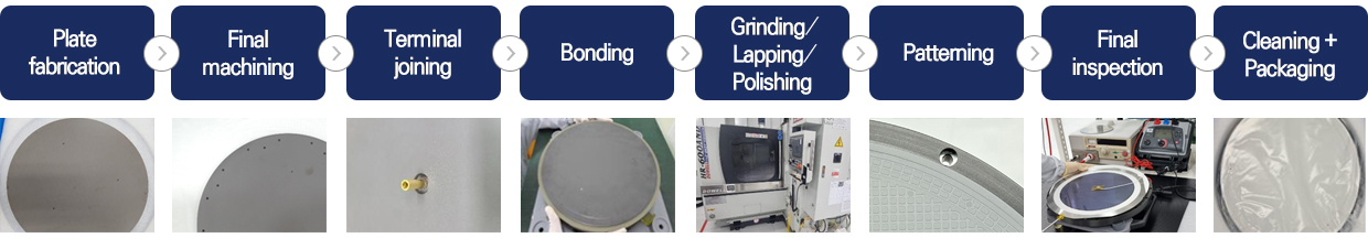An ESC is a component that holds the substrate using electrostatic force. The ceramic ESCs we mainly supply are used in semiconductor etch-related processes such as CVD, PVD, and implant, as well as in display processes including laser cutting and OLEDoS deposition.