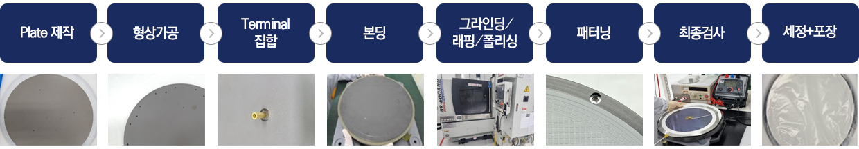 Plate 제작 → 형상가공 → Terminal 접합 (브레이징/납땜 등) → (개별 히터층본딩 →) New Plate 본딩 →L1 공정 |